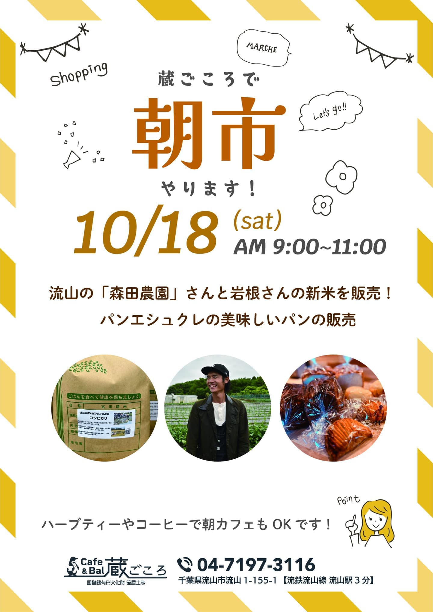 10/18(土)は蔵ごころ「朝市」開催!毎月第3土曜に開催している「朝市」を9:00〜11:00までテラスで開催します。 |